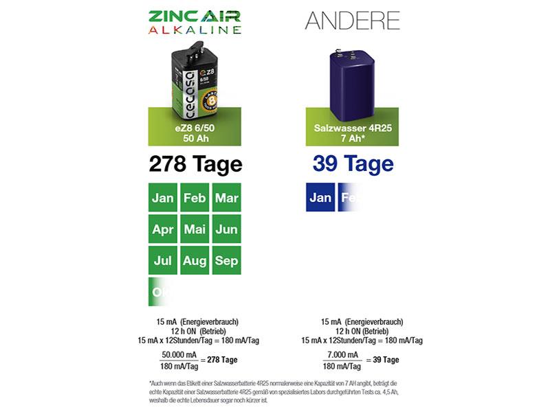 Zinc-air alkaline batteries from Cegasa are a particularly economical and environmentally friendly alternative to conventional zinc-carbon batteries. They deliver over eight times more energy, which means that batteries need to be changed less frequently - this not only reduces operating costs, but also transportation, storage and recycling costs. In this way, they actively contribute to a more sustainable use of resources.