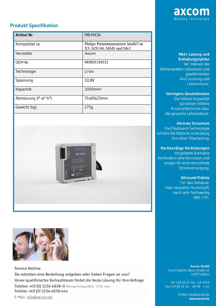 Because we at Axcom Battery Technology develop and then produce our rechargeable batteries ourselves, we are able to maintain full control over the quality of our products. Despite our elaborate and careful approach, it is important to us to offer you an affordable and fair price. Buy the Axcom MB-MX3A battery for the Philips IntelliVue X3, MX100, MMS and MX3 and benefit from our advantages: