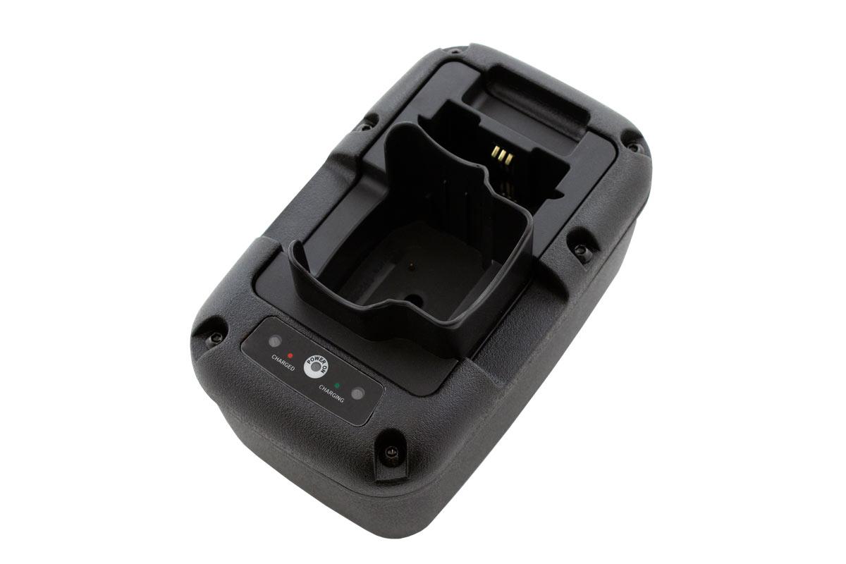 The integrated charging cradle can be exchanged for other adapters so that the charger can be used for other radio device models.
