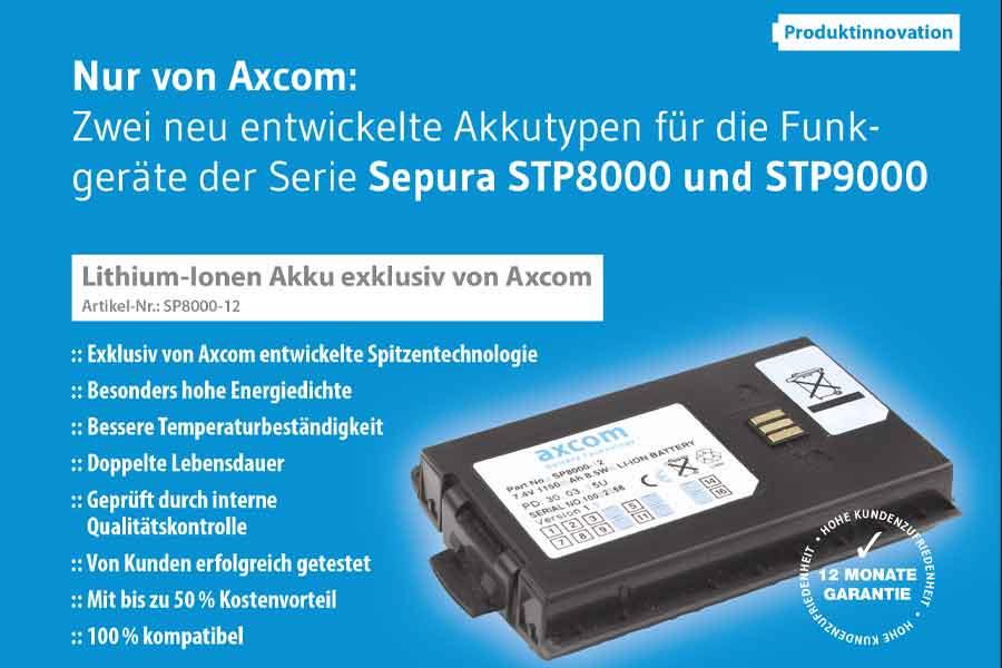 The SP800-12 for Sepura STP8000, STP9000, SC20 is exclusively developed by Axcom.
