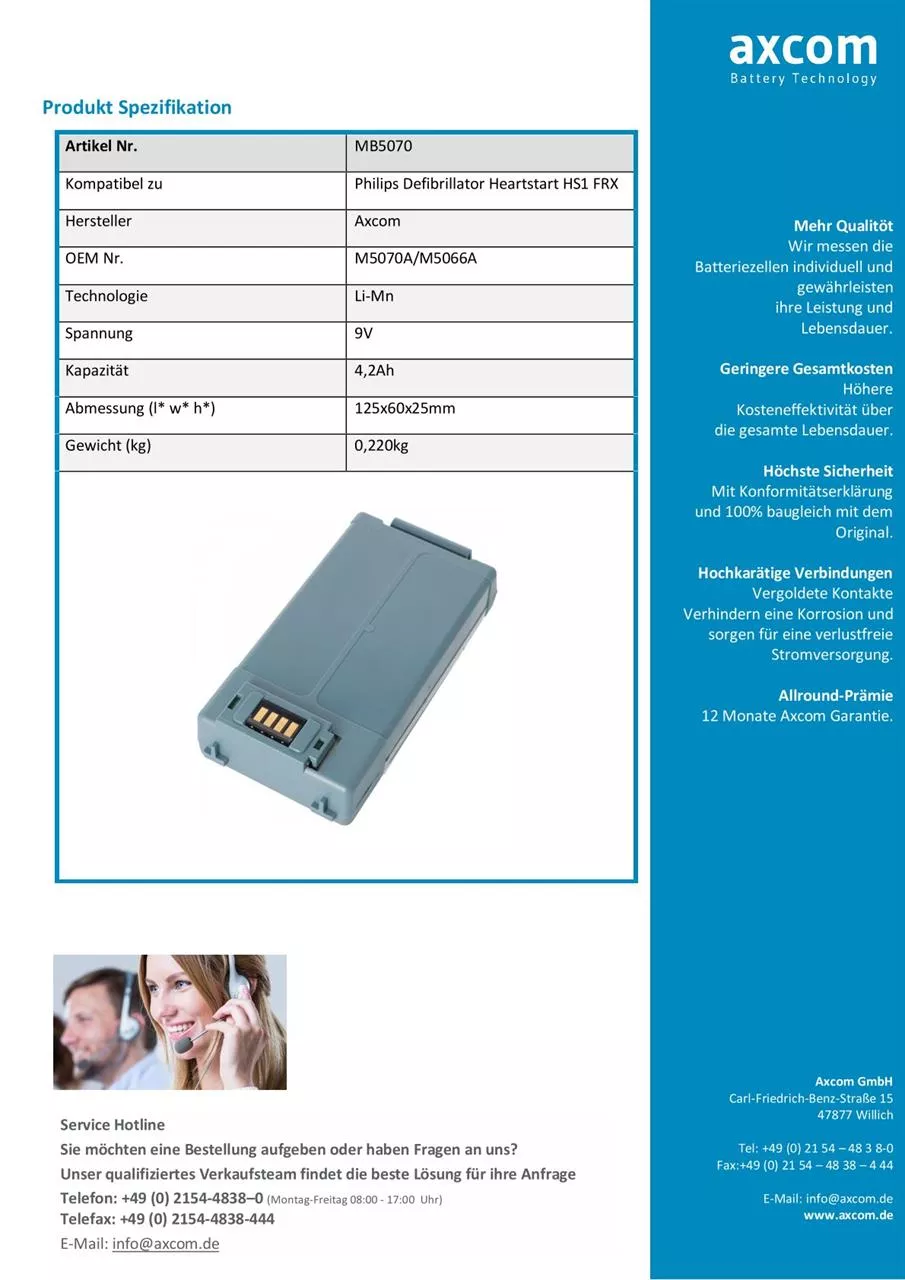 The MB5070A lithium-manganese battery from Axcom is compatible with the Philips HS1 and FRx AED defibrillators. It is equipped with high-quality, individually tested battery cells and is very precisely manufactured, ensuring absolute compatibility and a long service life of around 4 years. Gold-plated contacts ensure a loss-free power supply.