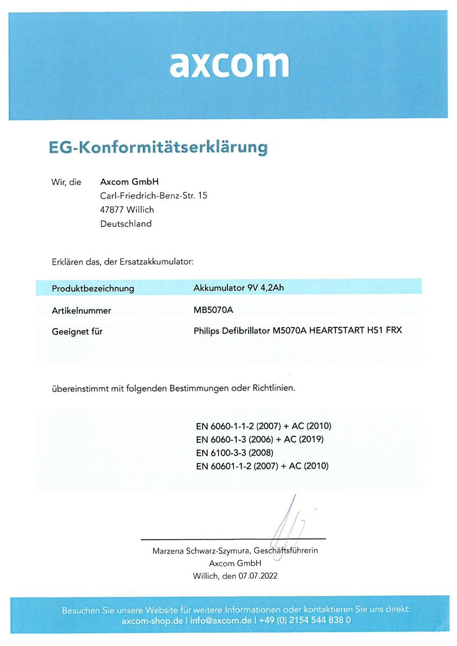 The MB5070A battery is compatible with the Philips AED defibrillators HS1 and FRx (OEM no.: M5070A, M5066A). It is 100% identical to the original, easy to install and does not need to be charged. We confirm compatibility with a declaration of conformity.