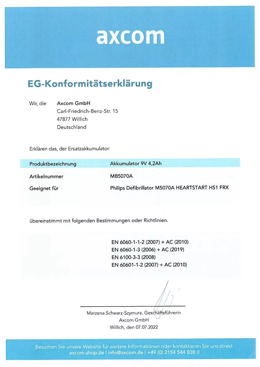 The MB5070A battery is compatible with the Philips AED defibrillators HS1 and FRx (OEM no.: M5070A, M5066A). It is easy to install and does not need to be charged. We confirm compatibility with a declaration of conformity.
